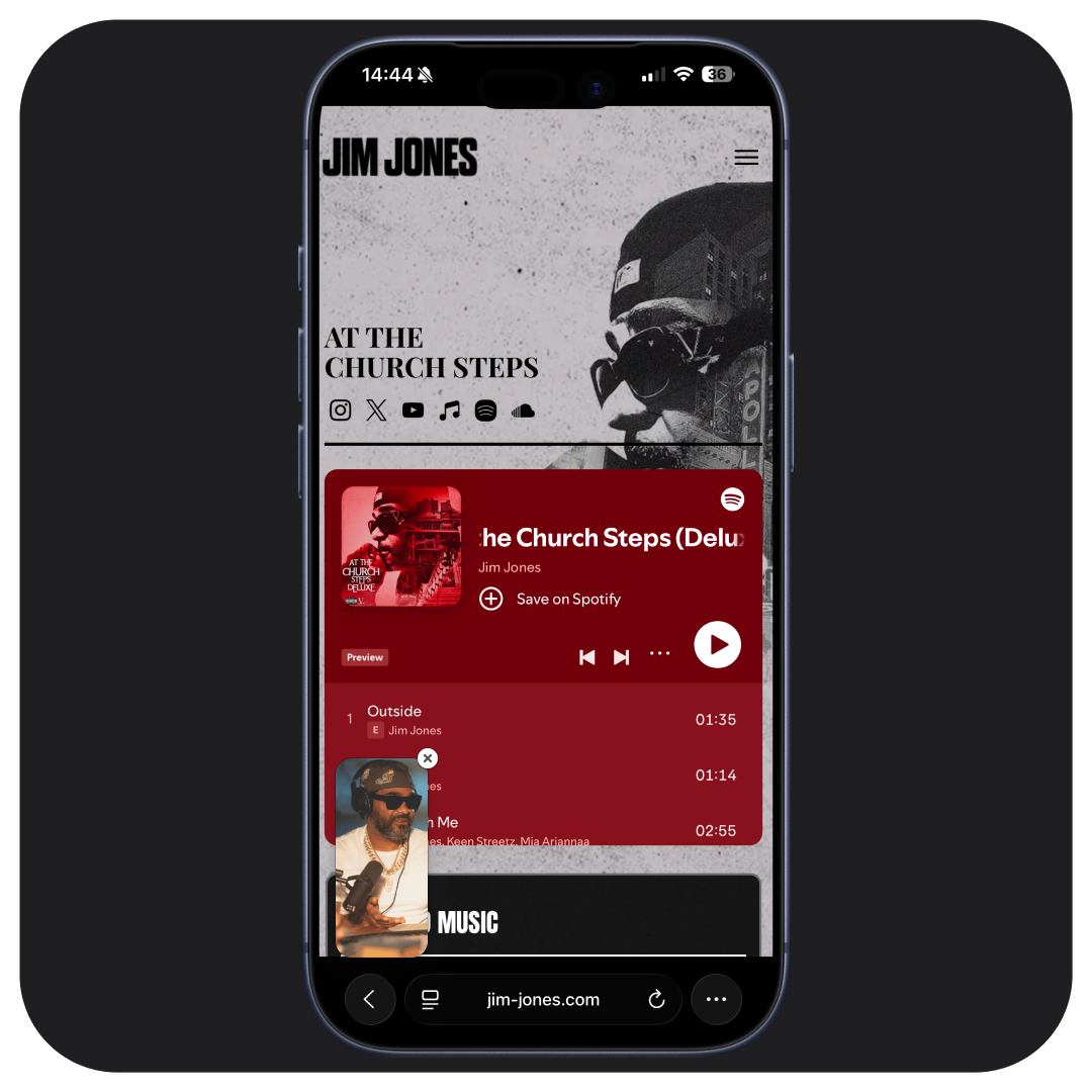 Your official domain becomes the command center for music, content, commerce, and community. Fans discover your latest releases, watch new videos, buy tickets, and support your journey inside one fully integrated experience.This is your channel and your revenue engine working together in real time.